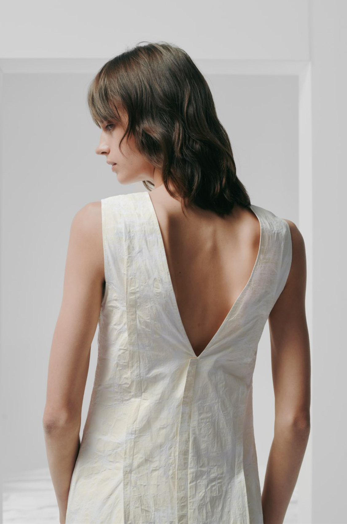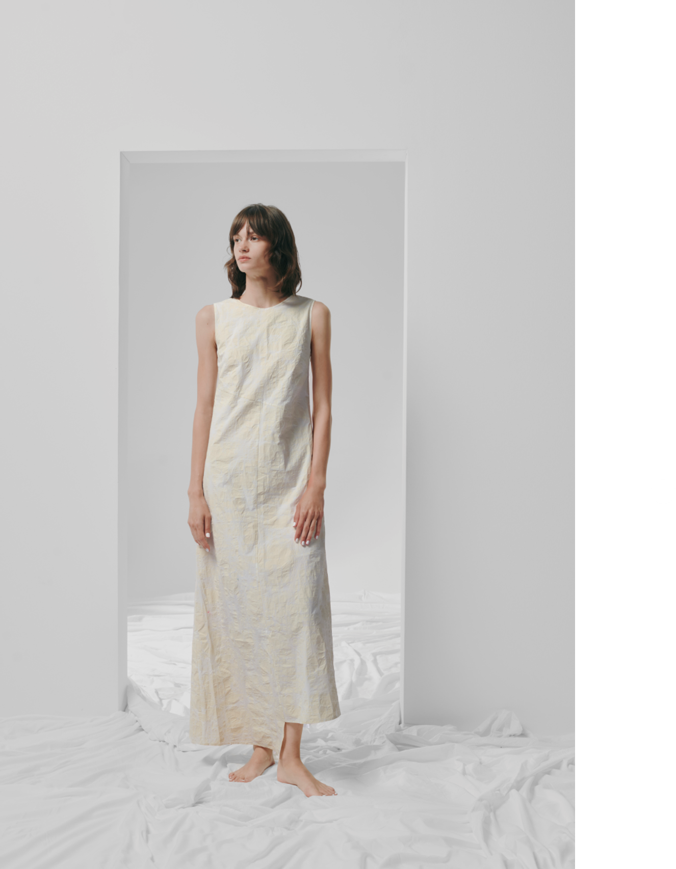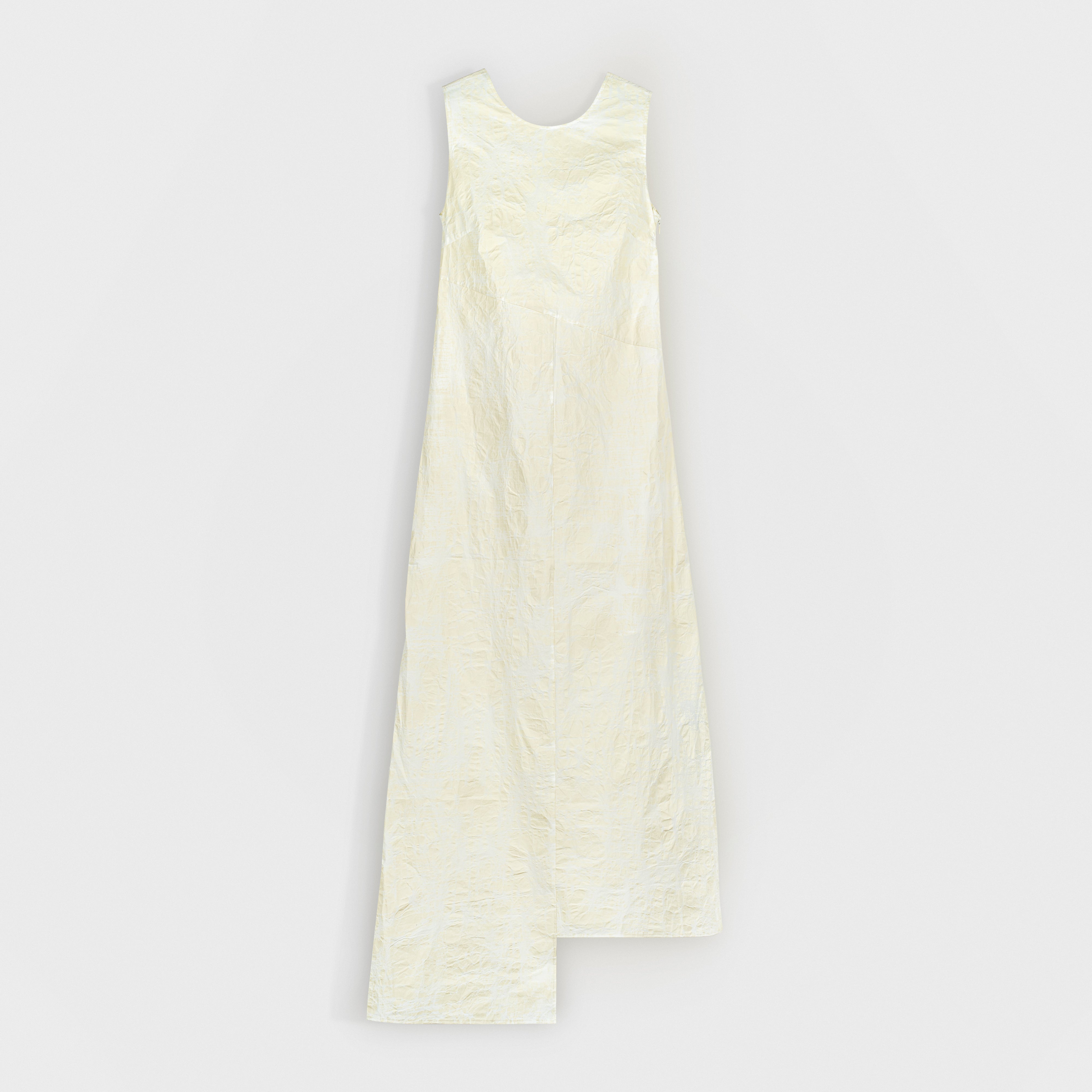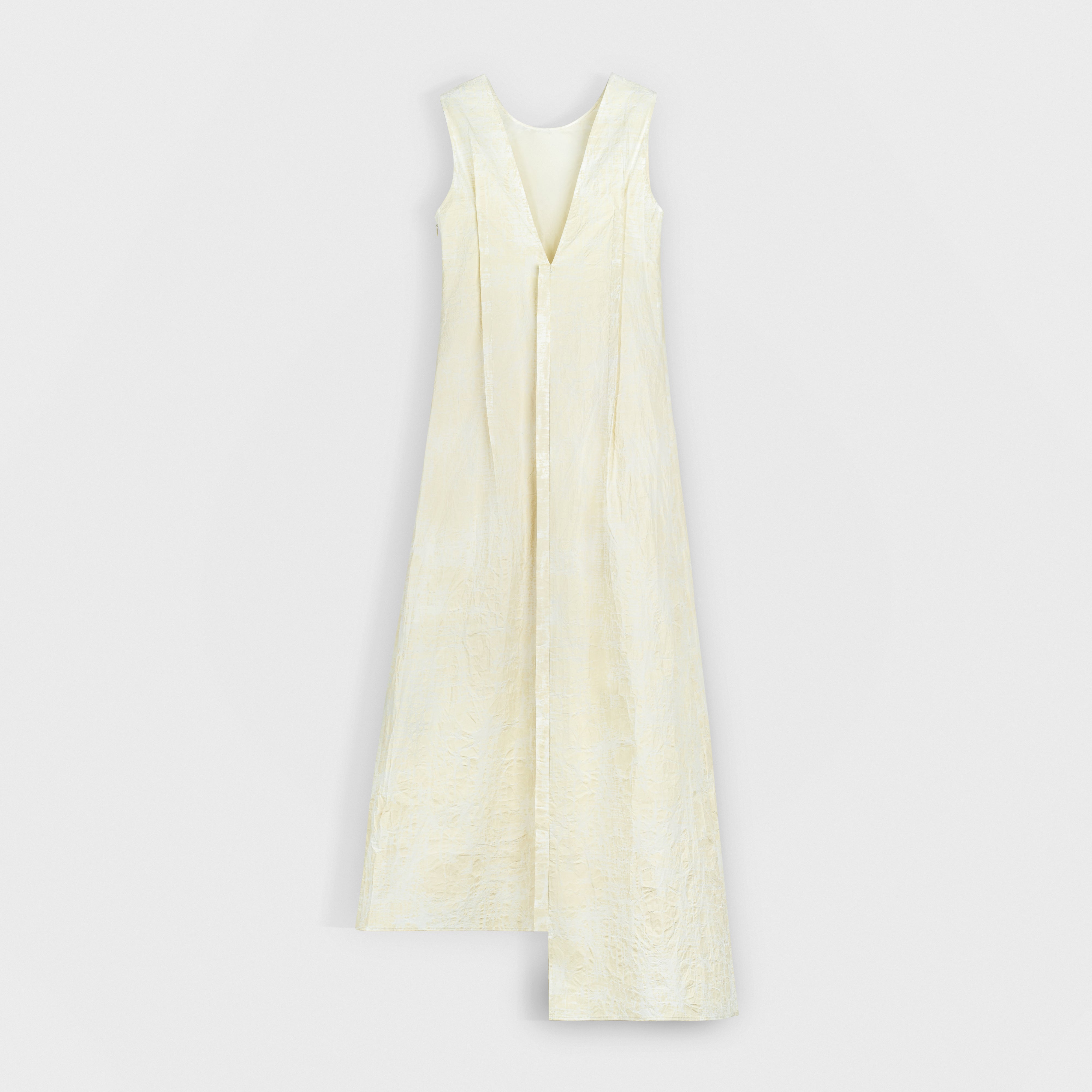 Sleeveless maxi dress in textured jacquard cotton. The fabric's embossed surface adds dimension to the minimalist cut, while the diagonal seams and asymmetrical hemline create a refined, sculptural flow.